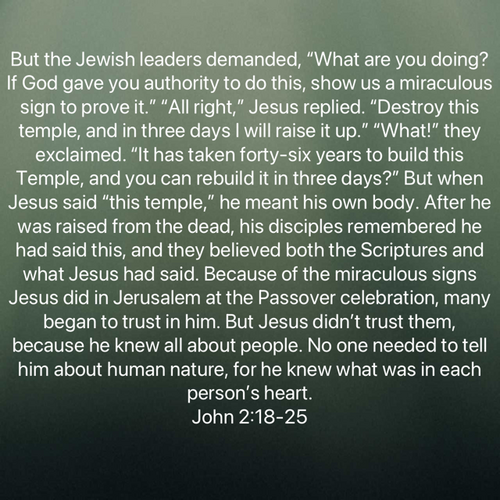 Continuing from yesterday, Jesus had just overturned all of the money changers’ tables that were set up in the Temple area. Needless to say, the Jewish leaders were not happy and demanded to know who had given Him the authority to do such a thing. They then challenged Jesus to perform a miraculous sign to prove that God had sent Him. His response was, “Destroy this temple, and in three days I will raise it up.” Of course, they scoffed, because they didn’t understand what He meant — but everything Jesus says has purpose and meaning. The disciples were listening and later — after His resurrection — they remembered and finally understood what He meant.