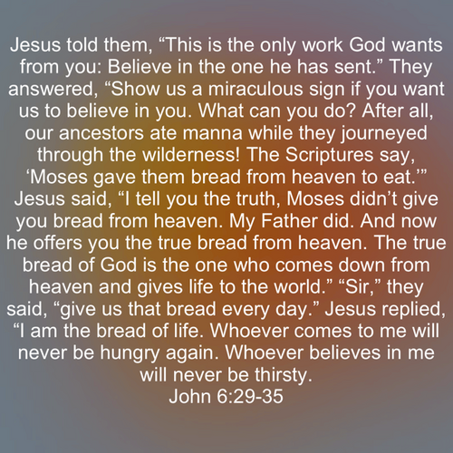 How is that possible? It brings us back to His original statement: “This is the only work God wants from you: believe in the One He has sent.”