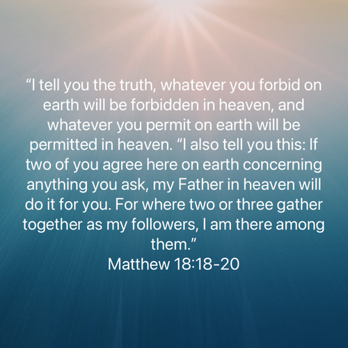 “Truly I tell you, whatever you forbid and declare to be improper and unlawful on earth must be what is already forbidden in heaven, and whatever you permit and declare proper and lawful on earth must be what is already permitted in heaven.” —Matthew 18:18 (AMPC)