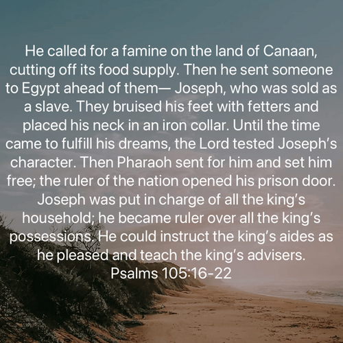 It is interesting that the psalmist uses the word ‘sent’ when referring to Joseph. Armed with a few dreams, the Lord ‘sent’ Joseph to Egypt, by way of his brothers selling him to a passing caravan hoping to never see him again. I am pretty sure Joseph didn’t feel like he was being ‘sent’ and his brothers for sure were not cognizant of God’s plan in the matter. Yet Joseph’s trip to Egypt would be the impetus for their provision down the road.