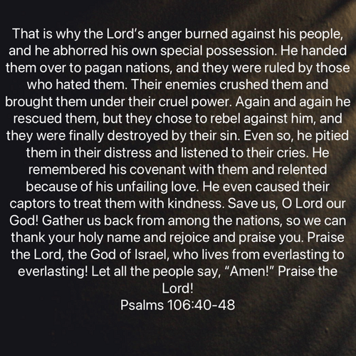 I see that in God as well, not only in His dealings with the Israelites, but also in His dealings with us. Even in our disobedience, God’s mercy and lovingkindness are renown.