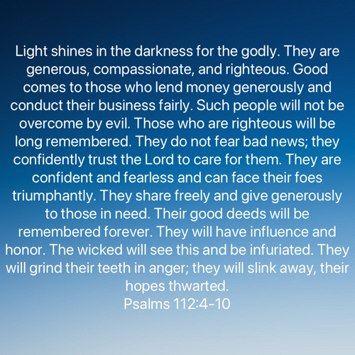 Those who are generous, compassionate, righteous, and who conduct their business fairly will not be overcome by evil - that’s a promise!