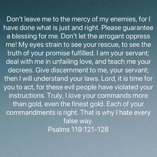 As we continue in Psalm 119, we notice a repeating pattern: the psalmist proclaims his love and adherence to God’s commands, expresses his hope in God’s deliverance, and cries out for God to act and deal with evildoers. Here, the psalmist declares he loves God’s commands more than even the finest gold and that he hates every false way.