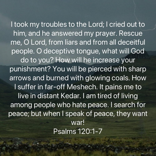The psalmist is feeling somewhat isolated among a people who are deceitful and are liars. He states, “I am tired of living among people who hate peace.” This made me think of Lot, who chose the best of the land when given the choice by Abraham because it looked good, yet he lived in Sodom and Gomorrah—and we know what happened there. How difficult it is when you know the right way to live, yet are surrounded by those that choose to ignore God’s laws.