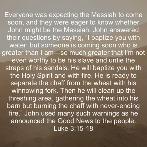 We now see the fulfillment of that playing out in Luke 3. What I find interesting is that the Scriptures say everyone was expecting the Messiah to come soon—so much so that they thought John might be the Messiah. John was quick to set them straight, clearly understanding his role in the grand scheme of things. He heralded the coming of the Lord just as Luke records was spoken through Isaiah.