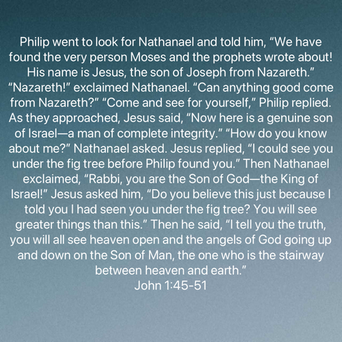 In this case, Philip has had an encounter with Jesus and goes to find his friend Nathanael, convinced that he has found the One Moses and the prophets spoke about. Nathanael is clearly more skeptical than Philip, yet Jesus makes a believer out of him in a short time by simply “reading his mail,” as some would say. Jesus tells Nathanael that He saw him under the fig tree before Philip ever found him. Better than any private investigator, Jesus sees everything — yet it can be a bit disarming to realize that even when we think we are alone and unseen, there is always One who sees us. I can almost picture Nathanael thinking, “Wait — how did He know I was there?”
