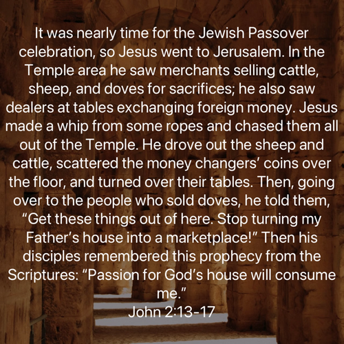 Jesus had a passion for the house of the Lord and was deeply upset by all the buying and selling that was taking place on hallowed ground. The last thing He — and I’m sure many others — wanted to hear while worshiping God was the sound of modern-day cash registers and the clinking and clanging of coins.