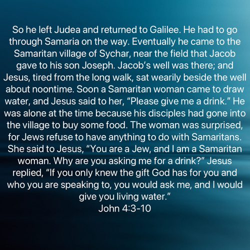I love how Jesus interacts with people. He knows exactly what they need before they ask, and He has a purpose for every encounter. For Nicodemus, as we discussed over the last few days, Jesus addressed the matter closest to his heart. Though Nicodemus was a respected religious leader, he still saw something in Jesus that he knew he lacked despite all his learning. Here we have a Samaritan woman, simply going about her business as she would on any other day, and Jesus meets her right where she is and speaks with her.