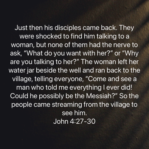 She did what the disciples were supposed to do. Scripture does not record anyone coming back with the disciples. She evangelized the whole city. What did the disciples do? We do not read that they created any kind of stir among the people. That may have been because they were Samaritans—whom they despised—and the disciples simply wanted to go into the city, grab something to eat, and get out of there with minimal interaction.
