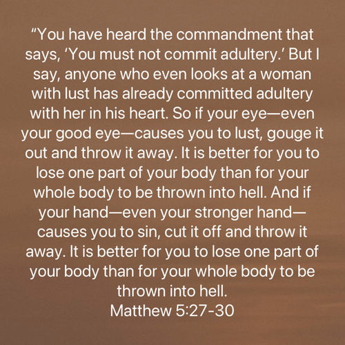 Jesus goes after matters of the heart once again. In this case, He addresses the sin of lust and adultery. Notice that it is not only “acted” lust but also “thought” lust that is condemned. Jesus makes it clear that unchecked lust is so serious that drastic, decisive action is required to deal with it. As Jesus says, “So if your eye—even your good eye—causes you to lust, gouge it out and throw it away. It is better for you to lose one part of your body than for your whole body to be thrown into hell.”