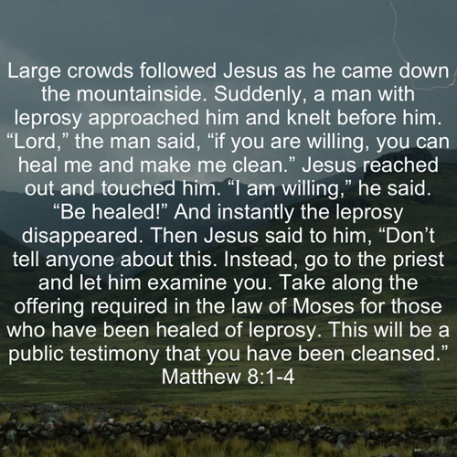 Jesus has just finished the Sermon on the Mount and is coming down the mountainside when suddenly He is approached by a man with leprosy. It makes sense that this man waited until the crowds dispersed, because by law he had to declare, “Unclean!” everywhere he went. There were an estimated 5,000 people or more listening to the Sermon on the Mount. His presence could have caused a stampede.