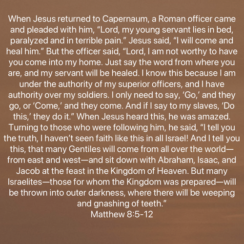 This is such an amazing account for several reasons. First of all, it was a Roman soldier who was doing the asking. Jews had very little to do with Gentiles, and the fact that Jesus was willing to go to his home to heal his servant was quite revolutionary. Jews would not be caught dead in a Gentile house, for it would make them “unclean.” Even after walking with Jesus, it took the Apostle Peter some convincing to go to a Gentile centurion’s house. God had to show him in a vision—three times—that it was acceptable to do so, and He reprimanded him for calling unclean what He had made clean.