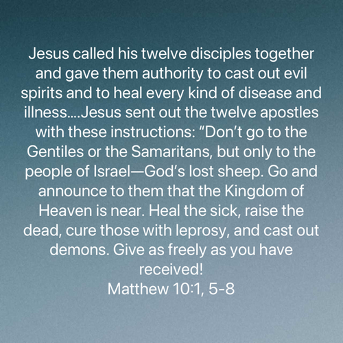 Consider the implications of this passage for a moment and read it again. Jesus gave His apostles the authority to cast out demons and heal every kind of sickness. His instructions were simple and straightforward: “Heal the sick, raise the dead, cure those with leprosy, and cast out demons. Give as freely as you have received.”