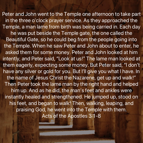 “I don’t have any silver or gold for you. But I will give you what I have. In the name of Jesus Christ the Nazarene, get up and walk!”