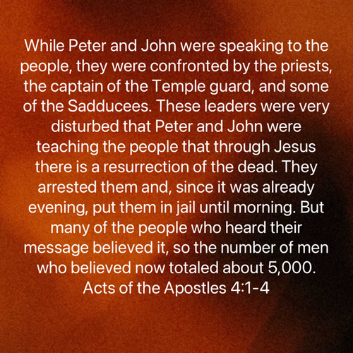 What had the Sadducees so upset was the fact that their sect of Judaism did not believe in a resurrection, and Peter was teaching the people that through Jesus there is a resurrection of the dead. Five hundred people were witnesses of Jesus’ resurrection. And let’s not forget this powerful Scripture found in Matthew 27:50–53 NLT: